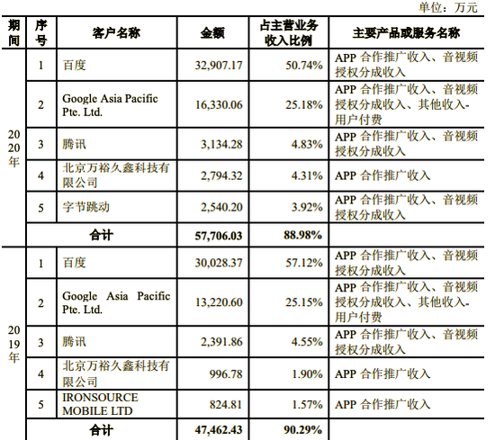 2018年、2019年、2020年,宝宝巴士来自前五大客户的营收收入占比分别为89.39%、90.29%、88.98%,主要客户包括百度、Google等广告联盟,且2019及2020年,仅来自百度的收入占主营业务收入比例均超过50%。