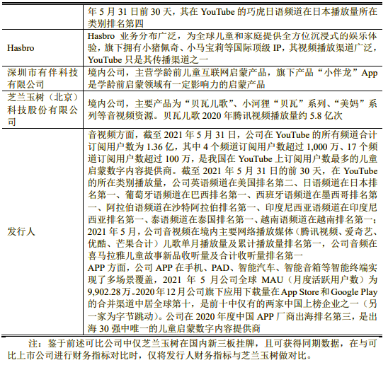 招股书中显示,宝宝巴士与各可比公司在经营情况、市场地位、技术实力、衡量核心竞争力等方面的对比情况如下: