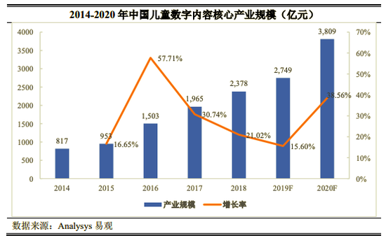 据市场调研机构Analysys易观发布的研究报告显示,2018年中国儿童数字内容核心产业规模达2378亿元,同比增长21%。预计至2020年,市场规模将达到3809亿元。