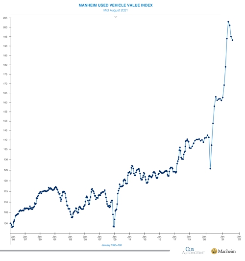 从分项数据来看,二手车价格——核心价格飙升的最大推手——在7月份有所下降。下滑一直持续到本月。