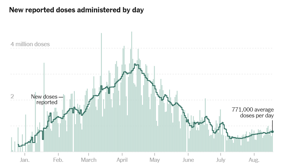 德尔塔病毒变种在美国尚未达到顶峰,但围绕该病毒的迅速发展暗示,感染的高峰迟早会到来。只落后于通货膨胀一步。除了更高的疫苗接种率,任何病例增长放缓的迹象都将是一个积极的发展。