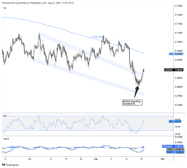 新西兰元/美元回升至下降楔形上轨上方,几周前价格就突破了这一上轨,但在50天简单移动平均线(SMA)附近转跌。四小时时间框架上的看涨吞噬蜡烛图形态指出了价格从上周末开始趋势反转的可能性,这引发了目前的走高。展望未来,50日均线可能再次成为阻力。