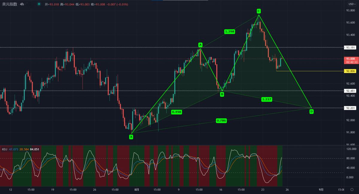 美元指数的四小时图显示,7月30日价格下探91.78(X点)后止跌回升,于8月20日触及93.73(C点),随后行情承压下行,目前在93.00上方窄幅整理。