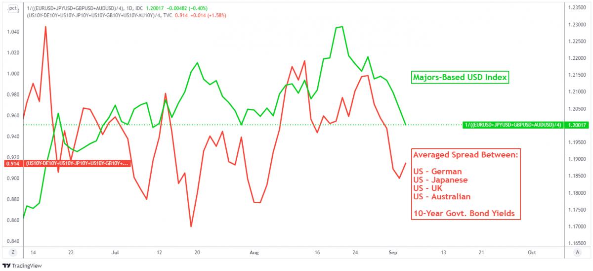 在周五的非农就业报告大幅低於预期後,美元走弱;使得笔者构造的基於主要货币的美元指数跌至下图所示7月以来的最低水平,最近两周的价格走势令人失望。美国失业率如期从5.4%降至5.2%,仅增加了 23.5 万工作岗位,而市场此前的预期为73.3万。尽管如此,但平均时薪年率确实出人意料地增至4.3%。