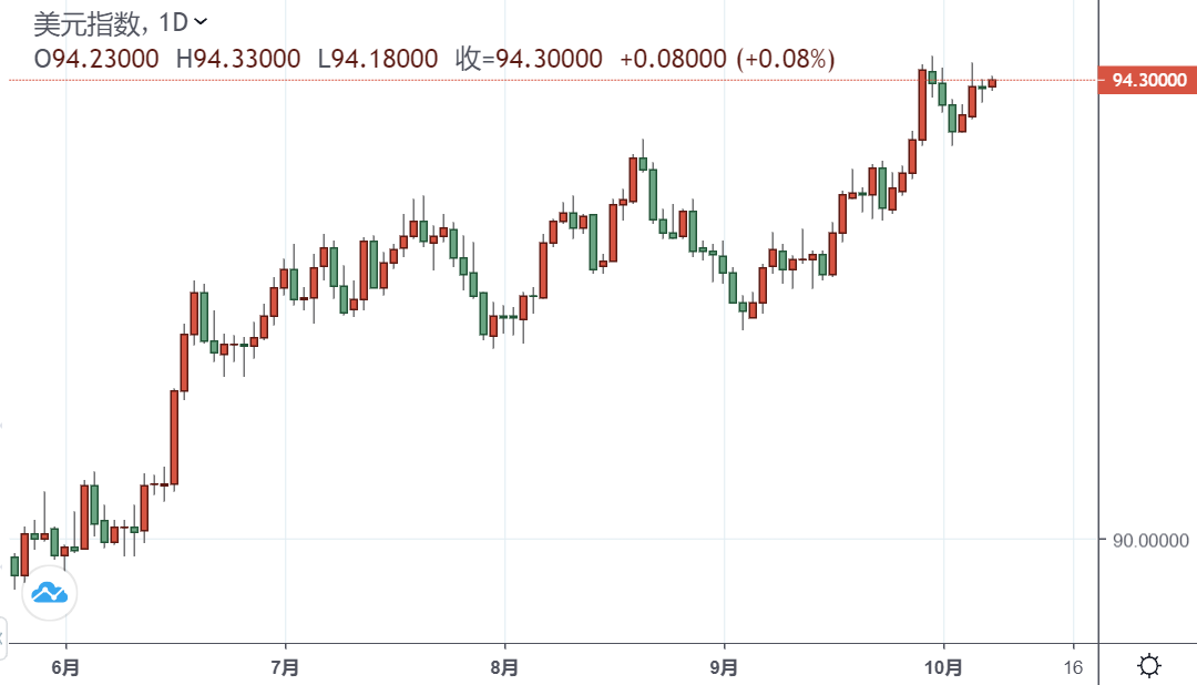 目前美元指数上涨0.08%报94.26,若突破94.50(2021年9月30日高点)将打开升向94.74(2020年9月25日高点)和94.76(200周SMA)的大门。另一方面,下一支撑位于93.67(10月4日低点),然后为93.51(20日SMA)和92.98(9月23日低点)。
