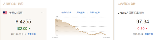 5月19日,人民币(6.4277, 0.0020, 0.03%)中间价报6.4255,上调102点,上一交易日中间价报6.4357,在岸人民币上一交易日收报6.4245。
