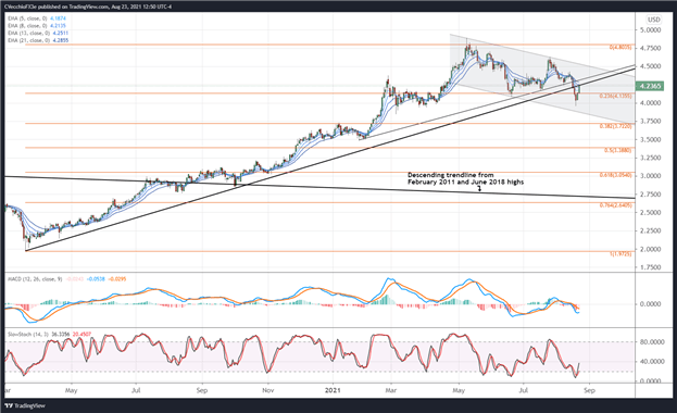 铜价在短线上的走势分水岭已经十分明显:8月底之前关注4.2700一线。倘若铜价在月底前重新站上这一水平,则可能重启疫情期间的上行趋势,表明此前跌破上行趋势线为一次假突破。此外,如前文所述,铜价反弹至2020年低点和2021年高点的23.6%斐波回撤水平4.2000,这将使多月以来正在形成的看涨旗形维持完好。