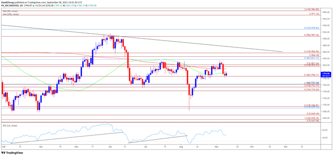 黄金价格从新的的月度低位1783一线反弹回升,因其中断了本周初以来的一系列更低的高点和更低的低点的势头。不过,黄金价格是未能成功上探7月高位1834一线削弱了黄金近期的复苏,因其重新回到了200-日SMA(1809附近)下方。