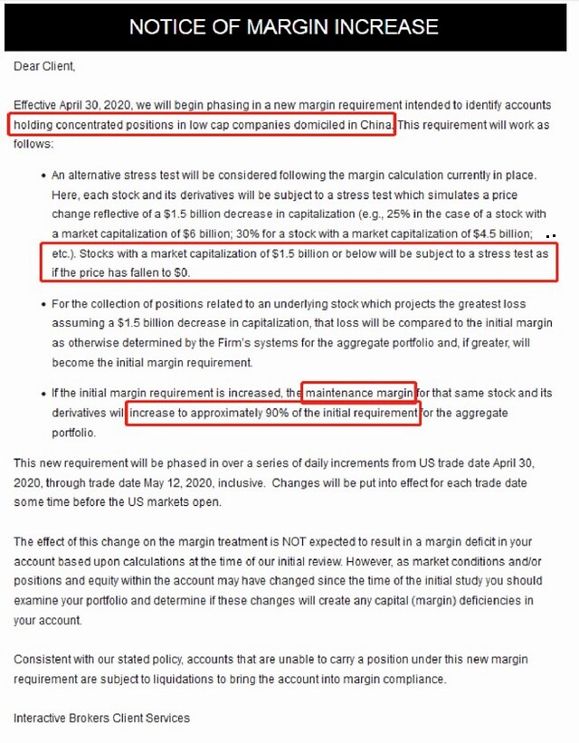 邮件指出,这项新要求将会在4月30至5月12日的美国交易日中逐步进行,这些变化将在每日盘前完成。盈透特别强调在最初的审查中不会造成保证金赤字,但随着市场、仓位和账户内股票的变动,投资者需要检查该变化是否会造成现金/保证金赤字。那些无法满足新保证金要求仓位的帐户将会面临平仓,以满足保证金合规要求。