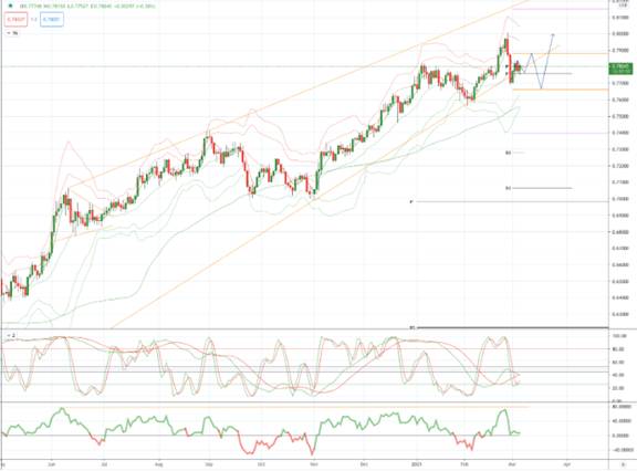 澳元兑美元从技术和交易的角度来看,由于目前主要趋势线支撑位于.7560,因此有望成为目标第5浪向上目标至.8000。内部下降趋势线的最终收盘突破0.773将鼓励看涨的论点。