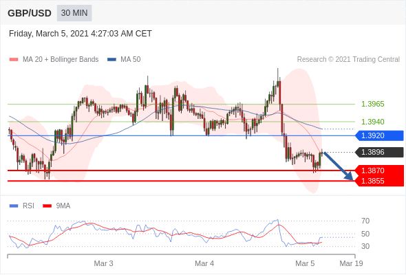 在 1.3920 之下,看跌,目标价位为 1.3870 ,然后为 1.3855 。