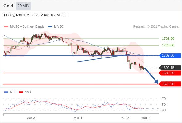 在 1709.00 之下,看跌,目标价位为 1685.00 ,然后为 1670.00 。