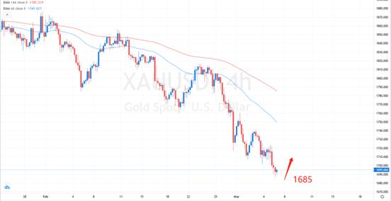 【技术点评】:H4周期显示,短期黄金持续在1700附近震荡。建议投资者可考虑1685附近做多,止损1660附近,止盈1710附近。