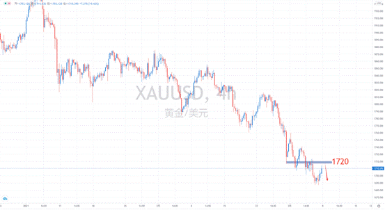 【技术分析】:H4周期显示,价格保持完好的空头流向,建议投资者可考虑1720附近做空,止损1735左右,止盈1700左右。