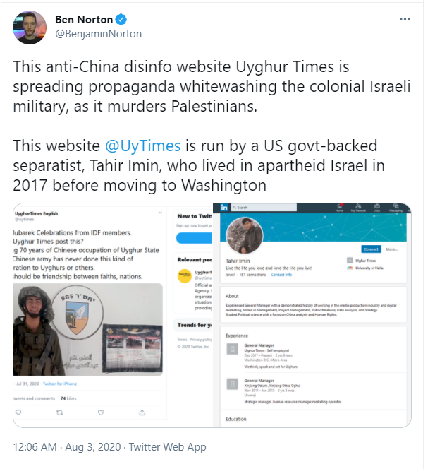 去年有外国网民还曾扒皮发现,该账号背后一个被美国政府资助的运营者Tahir Imin,在多年前离开新疆后,曾在以色列生活过一段时间,然后才去的美国。