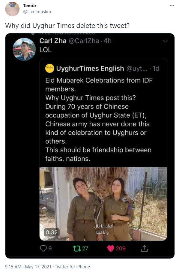 “(以色列国防军的)这种做法,才是不同信仰和国家间应有的友谊”,这个“东突疆独”账号写道。