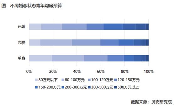 而支撑青年购房梦的,是“多个荷包”。《报告》指出,73.19%的单身青年受访者购房资金中有自有存款,60.86%有家人支持,高于恋爱中或已婚状态的青年群体。但是,与已婚青年相比,单身青年的购房实力稍逊,购房预算在百万元以上的单身、恋爱、已婚占比分别为54.01%、64.14%和72.50%。