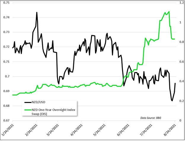 这一数据显示新西兰经济出现了恶化的迹象。跨境贸易的下降可能是由于其区域贸易伙伴受到疫情影响的消费下降所限制,与澳大利亚一样。此外,新西兰国内也出现了以奥克兰为中心的新冠疫情,该市目前处于四级封锁状态,至少要到8月31日才能解封。随着亚太地区应对delta变异毒株的压力越来越大,新西兰央行的升息押注已经消退,1年期隔夜掉期利率下降就是证据。