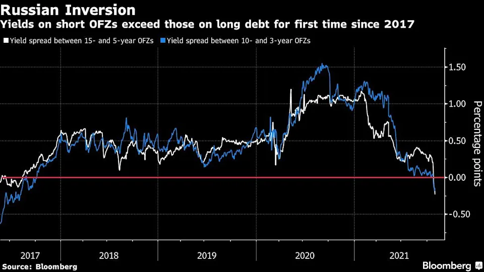 为控制通胀继续上行,今年以来,俄罗斯央行已经连续6次加息,这令俄罗斯的长期债券赢得投资者的青睐。上周,俄罗斯10年期债券收益率自2017年以来首次低于较短期债券。