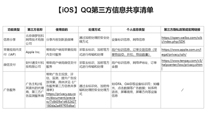 此外,根据个保法,向第三方提供个人信息时,应取得信息主体的单独同意。针对这一规定,截至目前,支付宝、微信、QQ等已在其隐私政策中进行了单列、加粗说明,并附上了第三方信息共享清单。