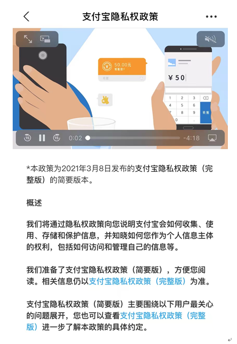 在支付宝“我的”中的“用户保护中心”,则对支付宝隐私权政策和蚂蚁集团隐私权政策进行了分别说明。在“支付宝隐私权政策”中,设有“简要版+完整版”两个版本,而在简要版中,采取“视频+文字+图表”的告知方式。