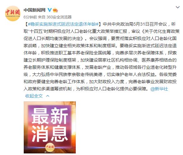 中共中央政治局5月31日召开会议,听取“十四五”时期积极应对人口老龄化重大政策举措汇报,审议《关于优化生育政策促进人口长期均衡发展的决定》。会议强调,要贯彻落实积极应对人口老龄化国家战略,加快建立健全相关政策体系和制度框架。要稳妥实施渐进式延迟法定退休年龄,积极推进职工基本养老保险全国统筹,完善多层次养老保障体系,探索建立长期护理保险制度框架,加快建设居家社区机构相协调、医养康养相结合的养老服务体系和健康支撑体系,发展老龄产业,推动各领域各行业适老化转型升级,大力弘扬中华民族孝亲敬老传统美德,切实维护老年人合法权益。各级党委和政府要健全完善老龄工作体系,加大财政投入力度,完善老龄事业发展财政投入政策和多渠道筹资机制,为积极应对人口老龄化提供必要保障。