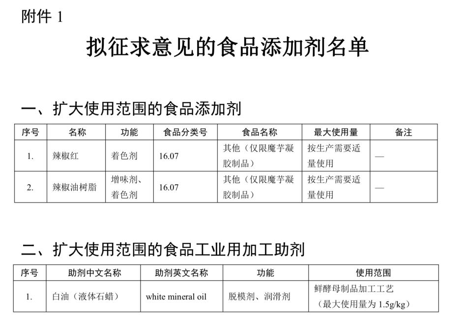 此次征求意见3种食品添加剂分别是辣椒红、辣椒油树脂、白油(液体石蜡),其中,辣椒红、辣椒油树脂均为申请扩大使用范围。辣椒红拟作为着色剂,用于其他(仅限魔芋凝胶制品)(食品类别16.07);辣椒油树脂拟作为增味剂、着色剂,用于其他(仅限魔芋凝胶制品)(食品类别16.07),两者的最大使用量均为按生产需要适量使用。