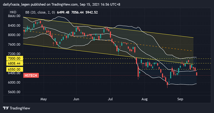 日图显示,恒生科技指数或面临跌破6300的空间,往下潜在支持关注7月低点6100和8月份低点5770等水平。而若反弹修正,上方阻力关注20日均线6500以及6700等水平。