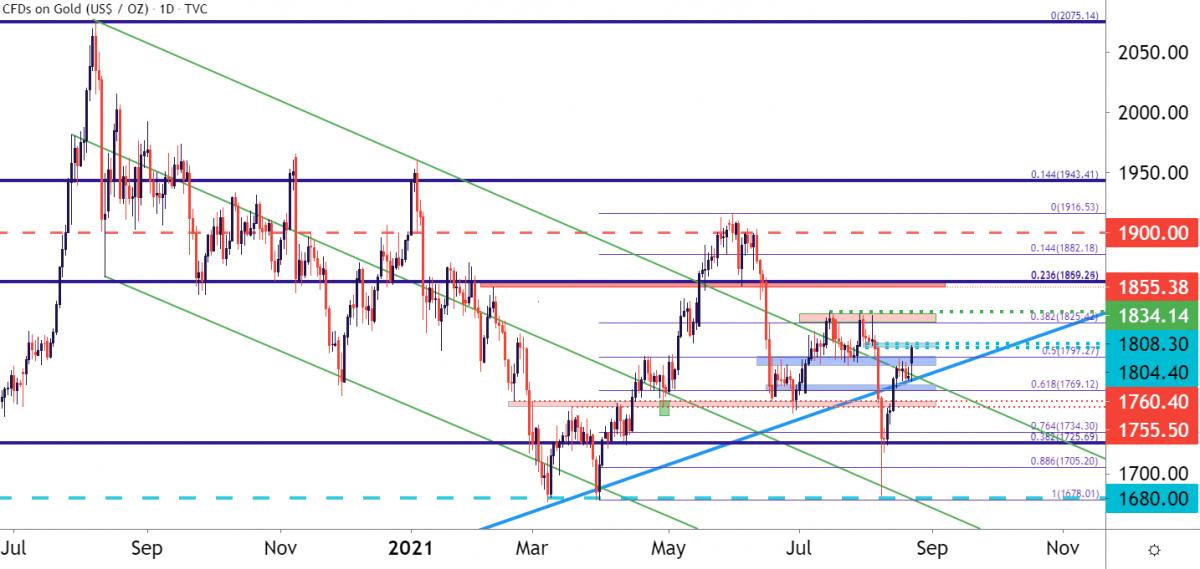 在过去的一周里,金价持续反弹,进一步将两周前的“闪崩”甩在身后。此时,金价从8月9日的闪崩低点上涨了超过7.5%,该低点恰好位于一个关键位置,即3月形成的双底形态的底部(2021年低点)附近。