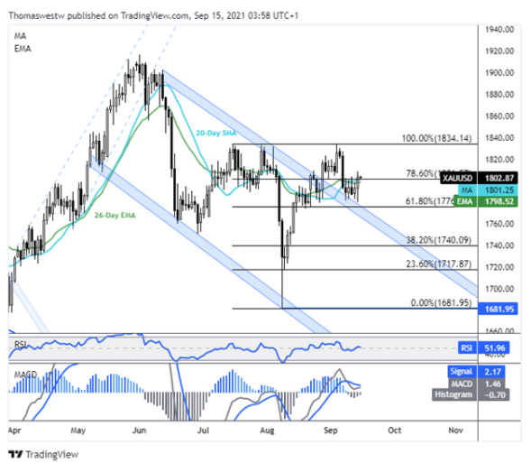 隔夜金价升破了20-日简单移动平均线(SMA)和26-日指数移动平均线(EMA)。7月/8月行情波动的78.6%斐波回撤水平1801.57也给黄金多头“让路“。此前黄金价格突破了8月底下行通道的阻力水平,现在该水平似乎正扮演支撑的角色。倘若上述提及的两条均线的支撑持稳,那么金价便有望进一步上涨。倘若黄金多头继续领先,那么1834.14将是潜在的重要阻力。