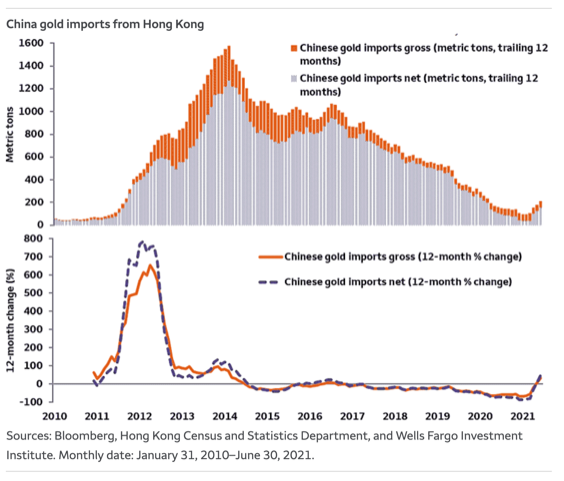 “中国过去几个月的购买尤其令人感兴趣。如下图所示,我们追踪了中国通过香港进口的黄金。我们这么做是因为中国大陆一直以不及时发布黄金数据而知名。”