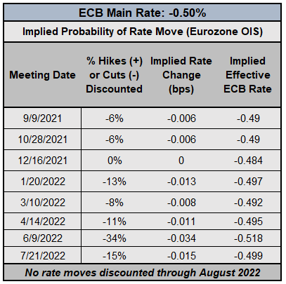 英国通胀压力的消退令投资者对英镑的热情有所减退,最近几天市场对加息的预期有所回落。在8月英国央行利率决议之后,市场开始计价2022年3月首次加息25个基点;而英国隔夜掉期指数表明,2022年5月(届时将公布新的季度通胀评估)主要利率上升的可能性最大。