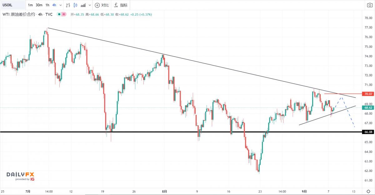 值得留意的是,周二(9月7日)高盛将美国2021年四季度GDP增长预期由6.5%下调至5.5%,预计全年GDP增长5.7%,不及此前预期的6.2%增长。在此情况下,作为与全球经济关系密切的油价受到拖累,WTI原油受阻于高位69.50美元并进一步下挫至67.66美元,刷新自9月1日以来新低。尽管WTI原油最终辗转回升至68.0美元上方整固,跌幅有所收窄,但仍录得连续三日下跌。