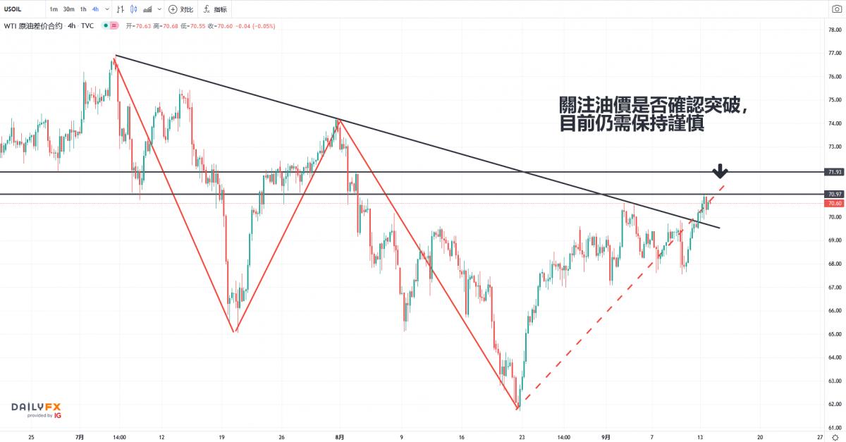 周一(9月13日)WTI原油进一步攀升至日内高位70.94美元,刷新自8月3日以来逾一个月新高,但仍未突破笔者昨日提示的71.0美元附近阻力。消息方面,昨日公布的OPEC月报表示,由于全球燃料消费上升,以及其他地区的产出中断,预计今明两年对OPEC原油的需求将更加强劲。