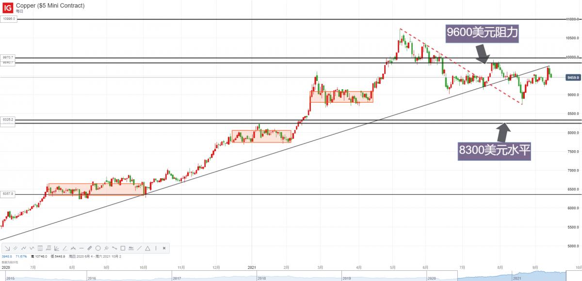 日线图显示,目前铜价受阻于长期上行趋势线并回落至9500美元下方整固,但若LME铜价后续有效企稳9200美元上方,则进一步反弹挑战1万大关的可能仍然存在。