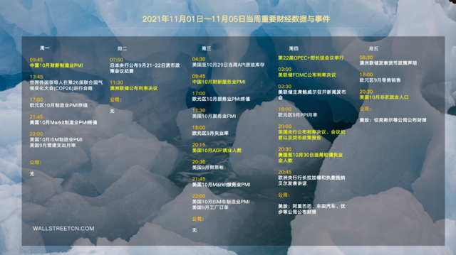 数据方面,周一和周三,中国将分别公布10月财新制造业PMI和财新服务业PMI;周三和周五,美国将分别公布10月ADP就业人数和10月非农就业人口数据。